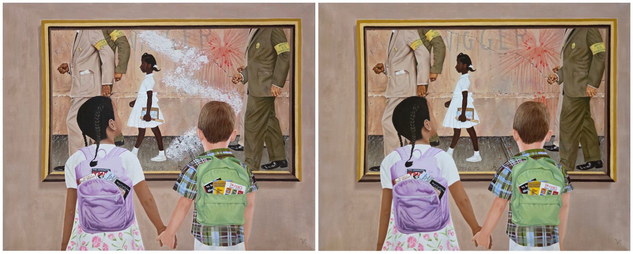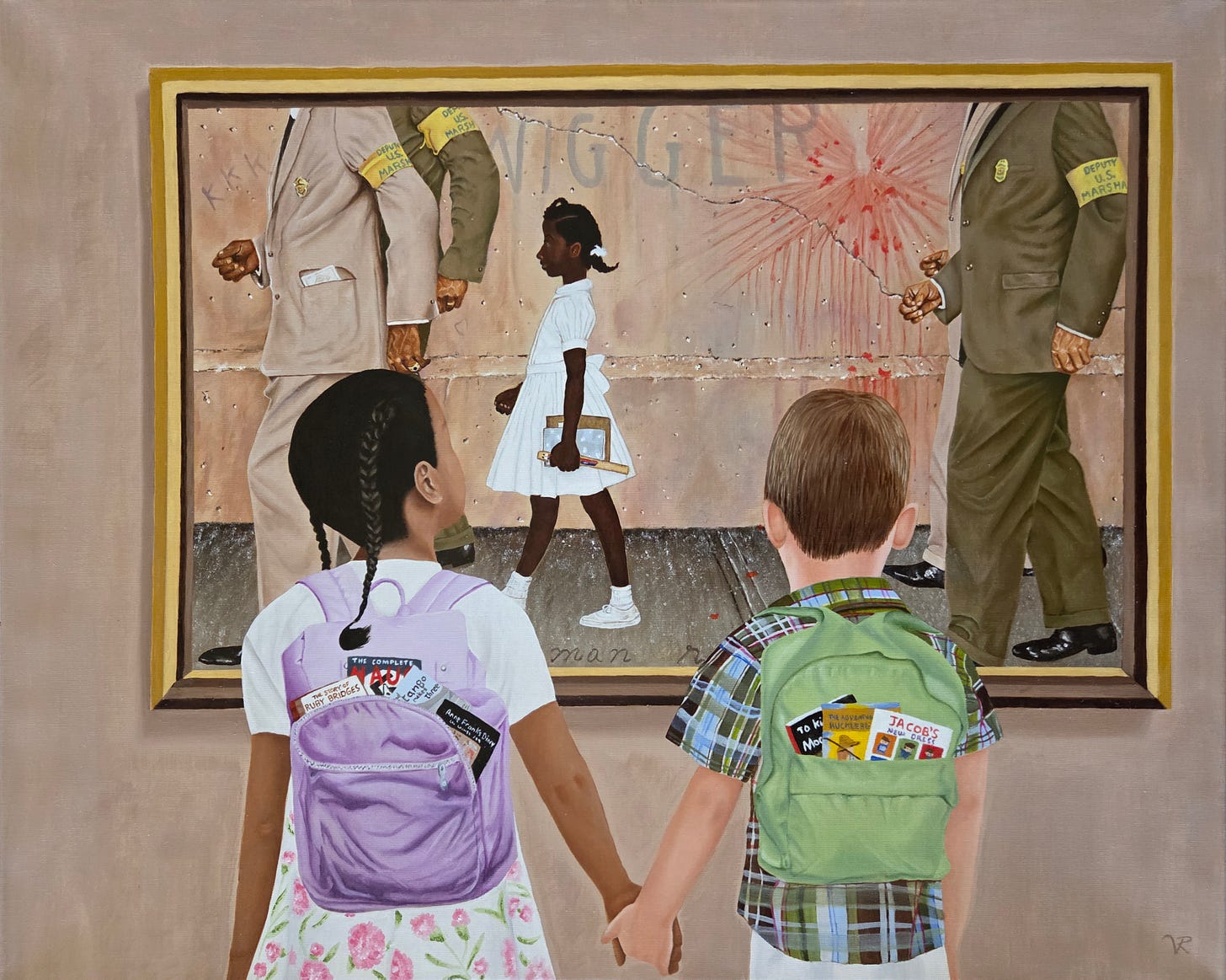 And now my painting, Whitewash, revealing one of America’s ugly truths. One that not only contains slavery but the systemic racsim that existed and still exists today. Conservatives have often attempted to whitewash history rather than confront the deep-rooted racism that this painting exposes. By downplaying the violence and resistance and ignoring or distorting facts, they seek to rewrite history in a way that erases the brutal realities of segregation and the courage of those who challenged it. But just like Rockwell, artists are here to remind the public of what exists.
